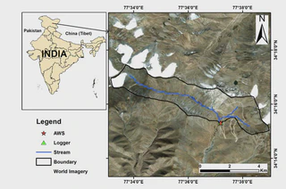 Recent studies have shown the cold and arid trans-Himalayan region comprises significant areas underlain by permafrost. While the information on the permafrost characteristics of this region started emerging, the governing energy regime is of particular interest. This paper presents the results of a surface energy balance (SEB) study carried out in the upper Ganglass catchment in the Ladakh region of India which feeds directly into the Indus River. The point-scale SEB is estimated using the 1D mode of the GEOtop model for the period of 1 September 2015 to 31 August 2017 at 4727 m a.s.l. elevation. The model is evaluated using field-monitored snow depth variations (accumulation and melting), outgoing long-wave radiation and near-surface ground temperatures and showed good agreement with the respective simulated values. For the study period, the SEB characteristics of the study site show that the net radiation (29.7 W m−2) was the major component, followed by sensible heat flux (−15.6 W m−2), latent heat flux (−11.2 W m−2) and ground heat flux (−0.5 W m−2). During both years, the latent heat flux was highest in summer and lowest in winter, whereas the sensible heat flux was highest in post-winter and gradually decreased towards the pre-winter season. During the study period, snow cover builds up starting around the last week of December, facilitating ground cooling during almost 3 months (October to December), with sub-zero temperatures down to −20 ∘C providing a favourable environment for permafrost. It is observed that the Ladakh region has a very low relative humidity in the range of 43 % compared to e.g. ∼70 % in the European Alps, resulting in lower incoming long-wave radiation and strongly negative net long-wave radiation averaging W m−2 compared to −40 W m−2 in the European Alps. Hence, land surfaces at high elevation in cold and arid regions could be overall colder than the locations with higher relative humidity, such as the European Alps. Further, it is found that high incoming short-wave radiation during summer months in the region may be facilitating enhanced cooling of wet valley bottom surfaces as a result of stronger evaporation.